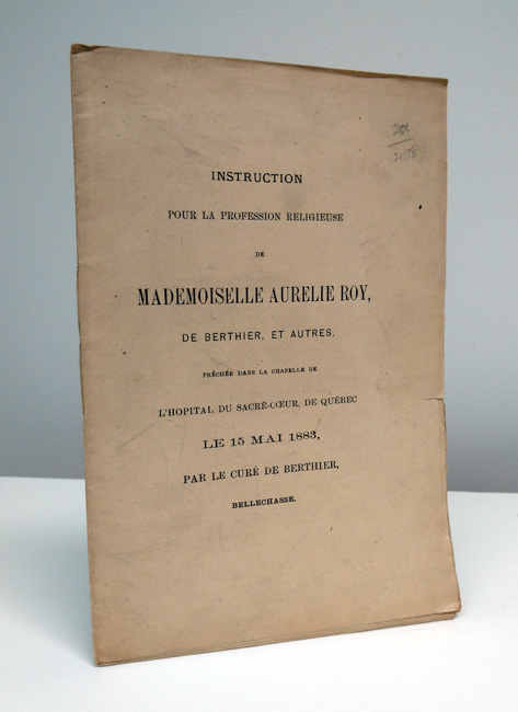 $ 30.00Sherbrooke, s.n., 1927. 12 p., frontis. (portr. de Mère Marie-Léonie, fondatrice), 18 cm., Br.