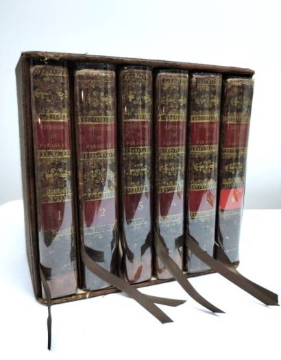 6 vol. P., Desaint; David; Durand, 1757. env. 400 p. par vol., cartes repl. (une en partie déchirée mais restaurée). 17,5 cm., Rel. plein veau d'époque (dos ornés, filets aux plats, pièces de titre et de tomaison, tranches jaspées, gardes marbrées, 3 coiffes de queue restaurées artisanalement, pièce de tomaison du vol. 6 récente, cachets et ex-libris de la Congrégation de Soeurs Grises de Montréal).